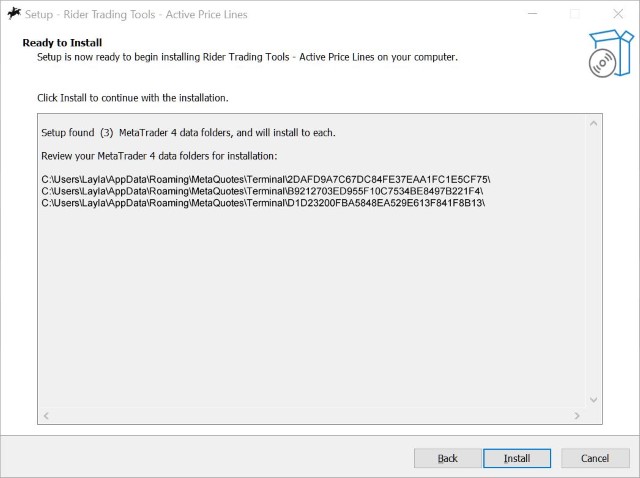The installer will locate your MT4 data folder. If you have more than one platform it will install the indicator into each.
