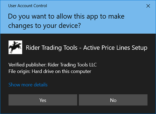 You may see a blue pop-up “Windows protected your PC” click More Info and confirm the Publisher is Rider Trading Tools LLC.